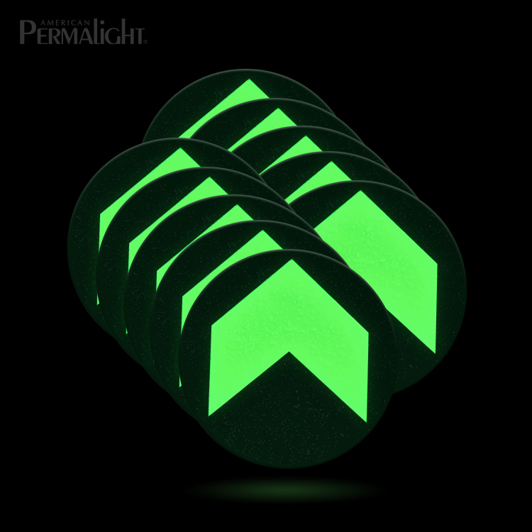 This product is a set of 4-inch diameter anti-skid floor dots supplied in a pack of 10. They are designed for placement on smooth indoor surfaces where additional traction and visual guidance are beneficial. The photoluminescent chevron can charge under normal lighting and remain visible in darkness, which supports wayfinding and route awareness during low-light situations.
